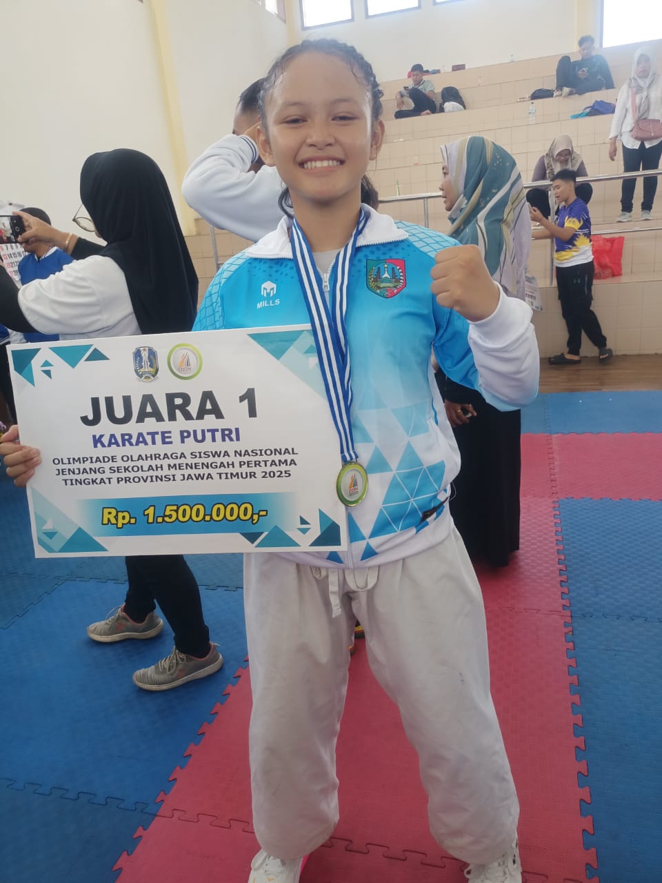 Atika Uzlifatul Jannah M.S., siswi kelas 8-I SMPN 2 Jombang, merasa bangga setelah meraih Juara 1 Karate Putri pada ajang Olimpiade Olahraga Siswa Nasional (O2SN) Tingkat Provinsi Jawa Timur 2025. Dengan medali di leher dan piagam penghargaan di tangan, Atika menunjukkan senyum kemenangan hasil kerja keras dan latihan disiplin yang dijalaninya setiap hari.