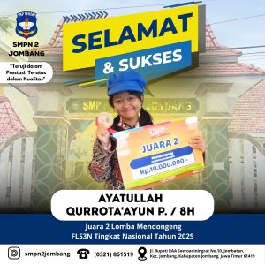 Jombang, 7 November 2025 — Di balik suaranya yang tenang dan ekspresinya yang bersahaja, tersimpan bakat luar biasa dalam diri Ayatullah Qurrotaa’yun Pamungkas, siswa SMPN 2 Jombang. Ia baru saja menorehkan prestasi gemilang dengan meraih Juara 2 Tingkat Nasional pada Festival Lomba Seni dan Sastra Siswa Nasional (FLS3N) cabang Mendongeng untuk jenjang SMP/MTs sederajat yang digelar di Jakarta.